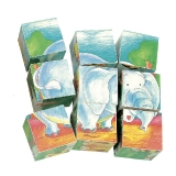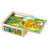 В наборе 9 кубиков, из которых можно собрать 6 картинок. Упакованы в красочную деревянную коробку.