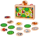 В упаковке, деревянные с красочными картинками. Задача ребенка-найти правильные пары, и назначить их к себе.