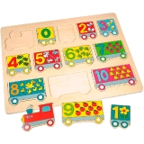 Деревянный паззл с паровозиком и вагончиками - вкладышами с изображением цифр от 0 до 9 и предметов и животных, соответствующих по количеству изображённой цифре.