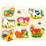 В рамке 7 вкладышей: петушок, лошадка, корова, кот, собачка, свинка и утенок. Каждый вкладыш имеет специальную ручку, взявшись за которую можно вытащить и снова вставить вкладыш в рамку, но для этого малышу необходимо найти соответствующую форму и поставить ее в подходящую ячейку.