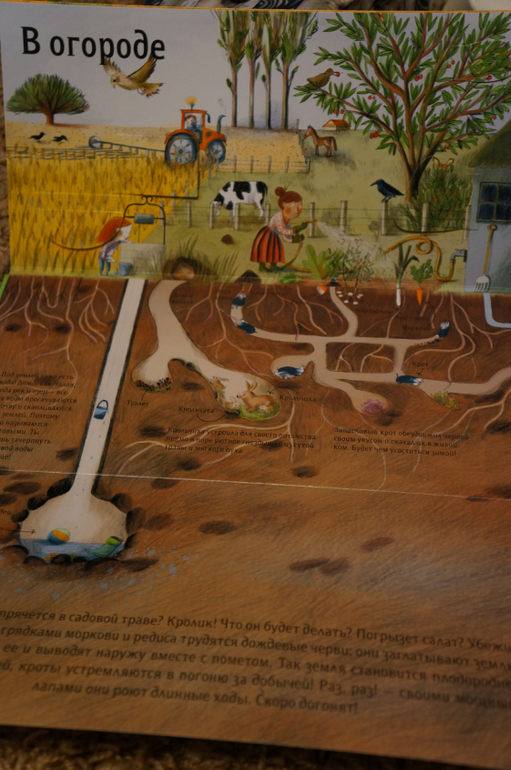 Наиболее привычный разворот - в огороде. В листве вишневого дерева в гнезде пищат маленькие птенцы. А запасливый крот готовит себе лакомства на зимовку. Дикие кролики устроились в своей уютной норке.