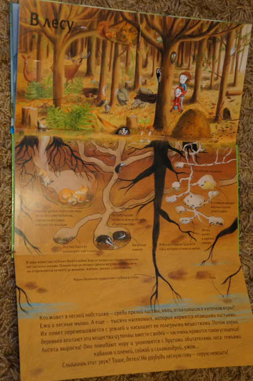 Дальше мы откинули разворот, и потеряли дар речи.... ведь перед нами предстает муравейник в разрезе со всеми его ходами и многочисленными "комнатами". В их городе есть хлебный амбар и кладбище, детская камера для яиц, отдельная камера для матки. По соседству с муравьиным подземным городом проживает семейство барсуков.