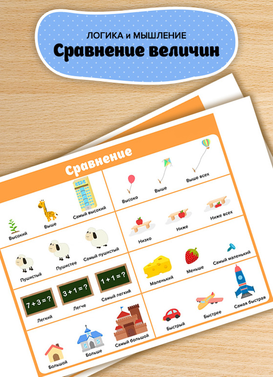 Пособие «3 степени сравнения» поможет ребенку изучить степени сравнения величин. Малыш узнает, что меньше и больше, горячее и холоднее, что самое легкое, а что находится выше всех. Пособие наглядно показывает степени сравнения, что существенно упрощает усвоение материала.