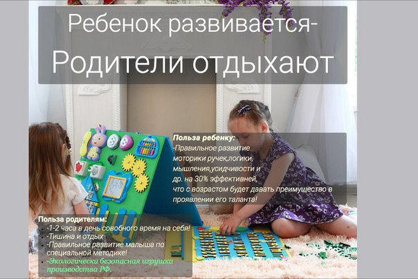 Выбор развивающих игрушек!Здравствуйте,дорогие мамы!Мы с женой нашли великолепную развивающую игру для деток. Это такие досочки,которые развивают моторику ручек,сообразительность,логику и очень притягивают внимание деток!А вы в это время сможете провести драгоценные 1-2 часика для себя любимой!Можете узнать подробнее :+7(985)062 54 80 или на сайте http://bizibordiki.ru/