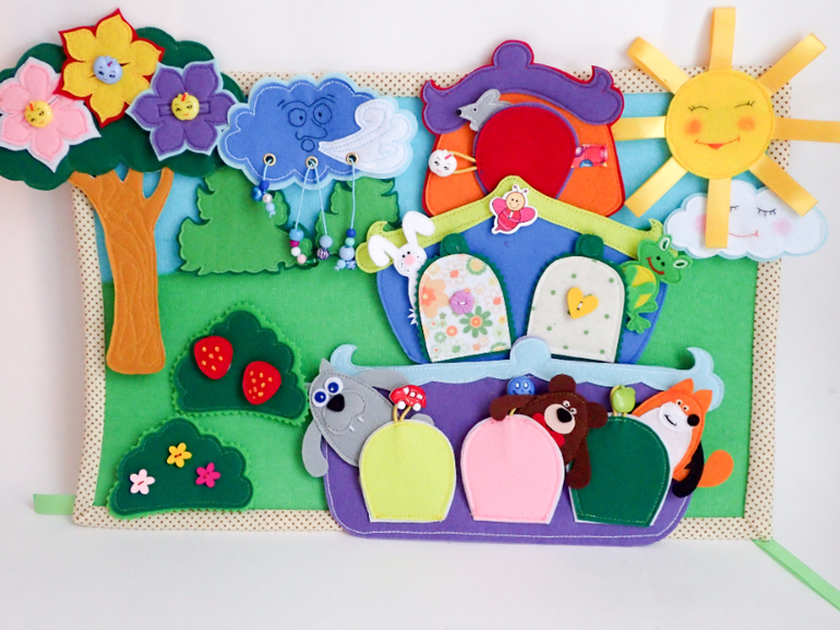 В работе использованы различная фурнитура для развития мелкой моторики: липучка, пуговицы, петельки, пришивные и магнитные кнопки, бубенчики.