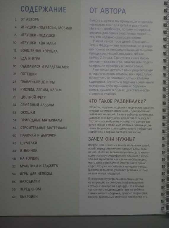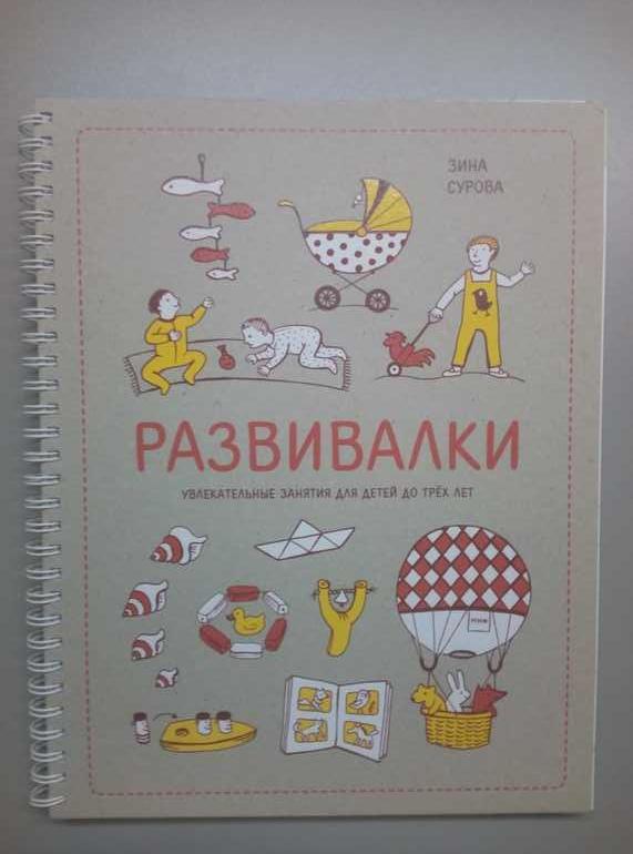 Развивалки - это просто находка для новоиспеченных родителей. Автор книга, Зина Суровая, мама троих детей, и она прекрасно понимает , как иногда трудно бывает занять детей и найти минутку для себя. Читаешь это издание, и поражаешся, на сколько быстро и незатейлево можно придумать игрушку - занималку для своего малыша: игрушка подвеска, игрушка подушка, игрушка из носка или перчатки. Есть советы как заинтересовать ребёнка непоседу одеться, усадить на горшок, развивалки из фетра и картона и ещё куча простых идей. Больше всего радует, что для подготовки не тратиться много времени.