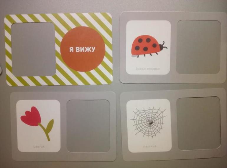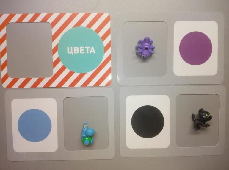 Есть пару моментов которые немного огорчило: конверт, который идёт в комплекте,для того чтобы брать карточки на улицу, маловат. Туда помещается только одна карточка и один лист с наклейками. И сами карточки сделаны из очень тонкого картона и быстро мнутся. В целом, игра понравилась. Развивает внимание, помогает изучить цвета.