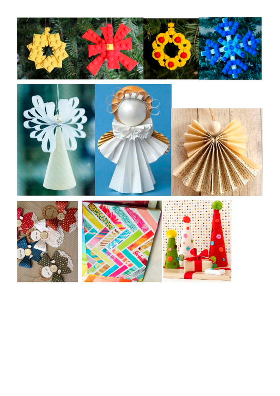 Нарядить елку и устроить семейную фотосессию на автоспуске - очень весело!!! Затем идут - упаковки для конфеток, игрушка на елку в виде балерины, закладка для книги, часы для указания погоды, игрушки из Лего на елку и не только, картина из полос разной текстуры и цвета, елочки из конуса и ниток.