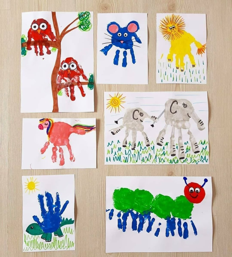 - Развитие воображения и пространственного мышления через создание разнообразных отпечатков и сюжетов из отпечатков ладошек и пальчиков.