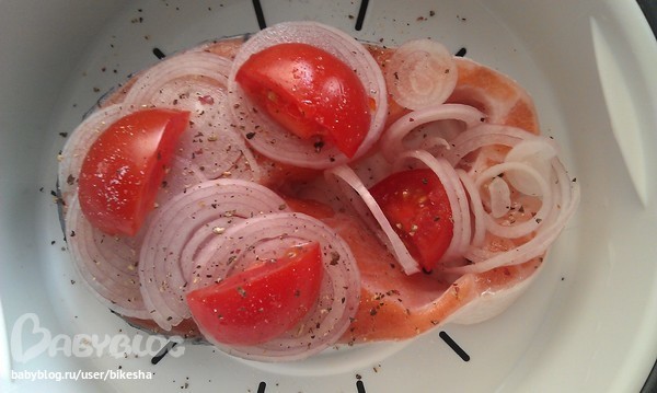 филе рыбы(сёмга), лук, помидорки черри.