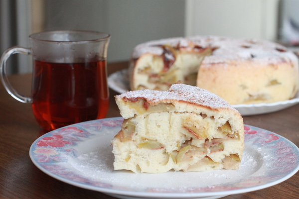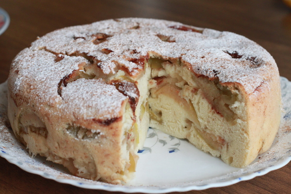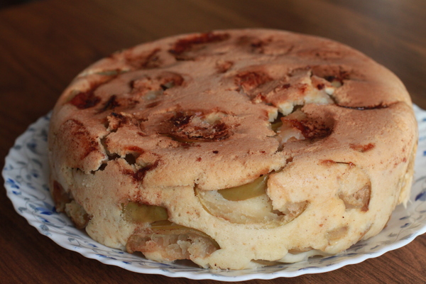 взбить яйца, ввести сахар, добавить разрыхлитель и муку, яблоки порезать на дольки, предварительно удалив серединку, в смазаную М.кастрюльку налить чуть теста, выложить часть яблок, присыпать корицей и сахарком, снова тесто - яблоки - тесто. выпекать на режиме "выпечка" 65 минут и 10 минут на подогреве. во время выпечки крышку не поднимать!