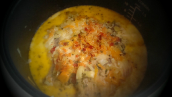 Лук и морковь порезать/потереть. В разогретую мультю налить оливковое масло. Положить лук и морковь. Минут 10 потушить. Выложить миску, оставив на дне немного лука и морковки.
