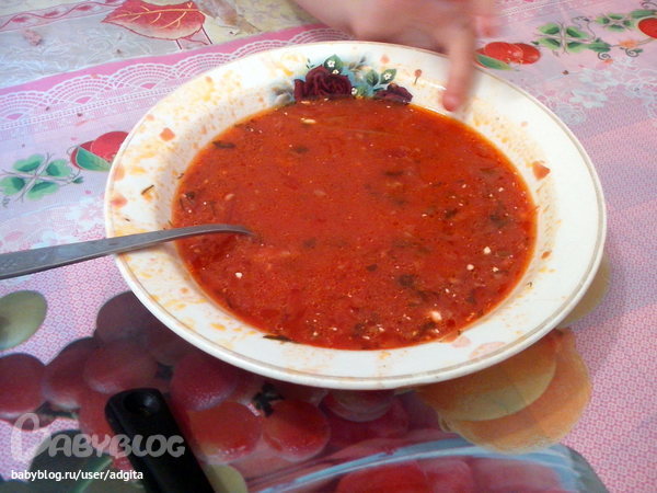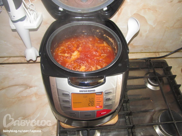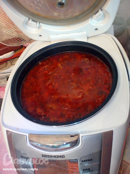 Все вместе перетереть и добавить в суп, выбрать программу СУП (ТУШЕНИЕ) еще на 10 мин. Я делала без сала, т.к. этот борщ давала сыну.