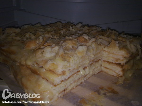 я сегодня перепутала тесто-вместо БЕЗдрожжевого взяла Дрожжевое! у меня две упаковки были из Ашана (Ашановское тесто), вот я и напутала. Оставила на ночь, дуреха, при комнатной температуре. Утром это тесто, предварительно самостоятельно разодрав упаковку, наглым образом уже намылилось сползти по тумбочке вниз на пол, а потом... кто ж его знает куда...но куда-то явно бы убежало, если бы не мои цепки руки! Поэтому эту огромную массу мне пришлось как следует помять, а потом раскатать на 6 пластов. В связи с чем от пыщности и следа не было...Что, впрочем, мне и надо было! Маман моя распознала подвох с готовым тестом сразу!!!! Муж говорит, лежа рядом довольный, что разницу не почуствовал. Ребенок старший сказал, так бы кажды день! (т.е. ему ваще по фиг какое там тесто заряжено). Гостям вроде понра, все ж не из магазина, а свое! Уплетали по 2, а то и по 3 (кому повезло) куска! А мне...Ну да, есть немного разница. Потолще что ли оно? Может быть пропитаться не успел Бонопарт мой, т.к обычно я его с вечера готовлю и он всю ночь пропитывается...Так что и не знаю...Наверное свое тесто и свой крем-лучше!!!