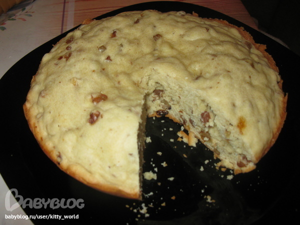 Растопить маргарин, добавить сахар, яйца, хорошенько рамешать) Добавить ванилин по вкусу, разрыхлитель, потом муку. Получается тесто, похожее на жвачку)) Добавить ошпаренный кипятком изюм и измельченный грецкий орех. Смазать чашу слегка маргарином, выгрузить в нее тесто, и выпекать 60 минут.