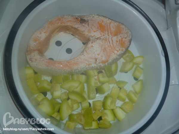 Готовим на паруВсе очень просто. кабачок порезала кубиками Выложила в чашу для приготовления на пару вместе с форелью, форель посолила смазала сметанкой. В мульту наливаем воды и ставим на рещим ПАР - РЫБА на 20 минут.