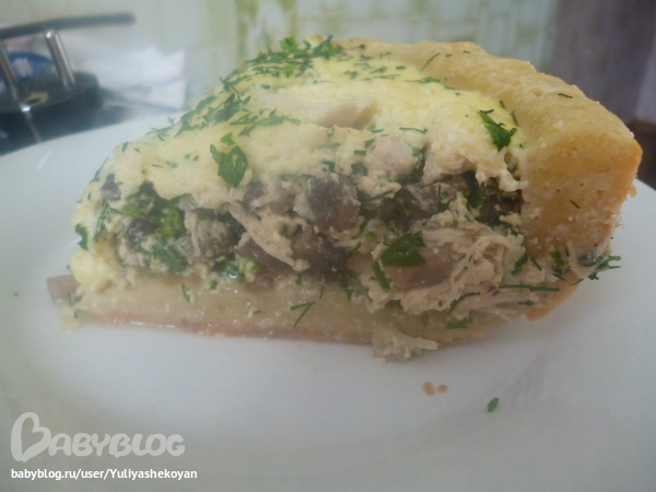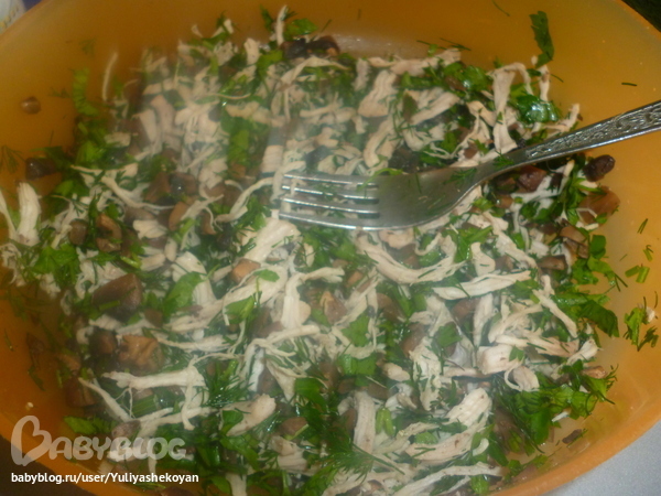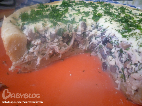 Пока тесто отдыхает готовим начинку, филе отвариваем до готовности в подсоленойводе и измельчаем. Грибы обжариваем с луком. мелко рубим зелень и все смешиваем.