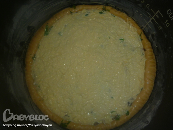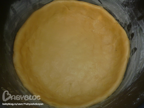 тесто достаем из холодильника и раскатываем круг, чашу смазать маслом и присыпать мукой, перекладываем наш круг в чашу мульти, формирует бортики высокие.