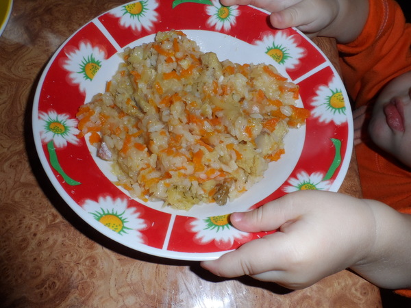 Получилось, что вода рис не покрывает, поэтому мин за 10 до окончания я все перемешала. После окончания приготовления дать постоять немного, чтоб рис впитал соки. Вкусняшка готова! Получается 3 порции