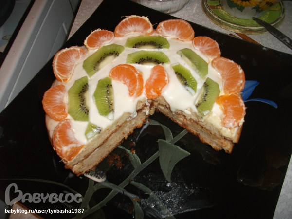 а на новый год я решила испеч торт. Только вот время пришлось подбирать на глаз, т.к. час это слишком много для тонкого коржа. Но всё равно торт получился пышным, вкусным и не подгорел)