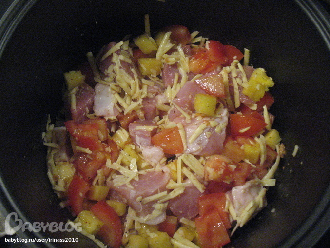 Мясо порезать кубиками по 2-2,5см, помидоры по 2см, ананасы по 1см, сыр натереть на крупной терке. Все смешать, добавив соль и специи, майонез. Готовить в режиме тушение 1 час. Получается жирное, мегакаллорийное, но нежнейшее и вкуснейшее мясо в кислосладком соусе:)!