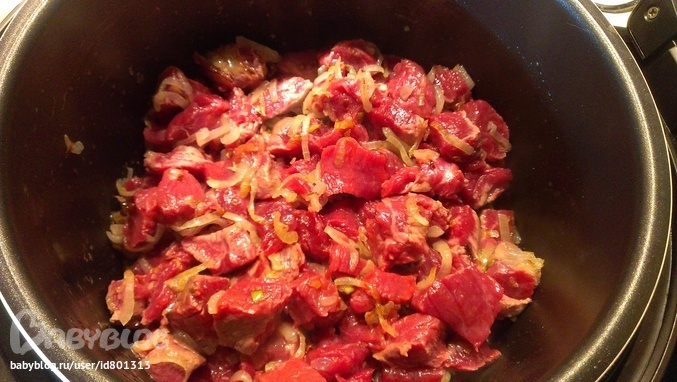 Блюда из мясаДошла очередь и до говядины)))) Получилось действительно, очень вкусно и, главное, быстро. Мясо нежное-нежное, и не скажешь, что говядина. Итак.... Режем лучок, обжариваем на функции "жарка" (Редмонд М-110), так как морковки в доме не оказалось - обошлись одним лучком, хотя, с морковью было бы интересней и вкуснее.