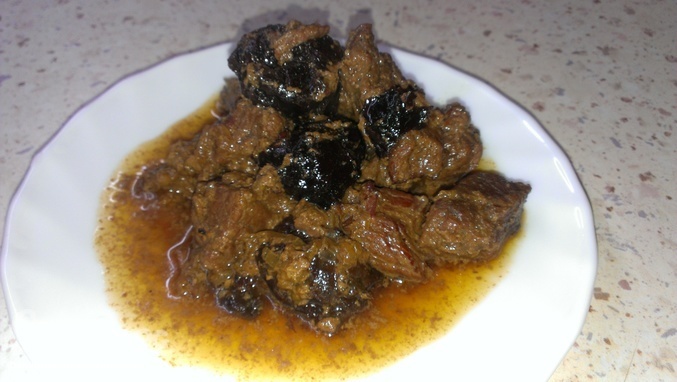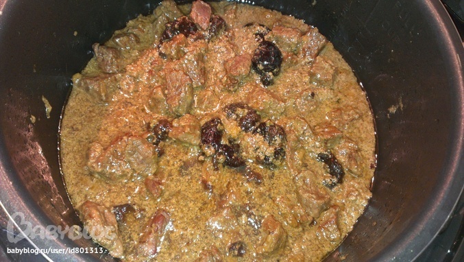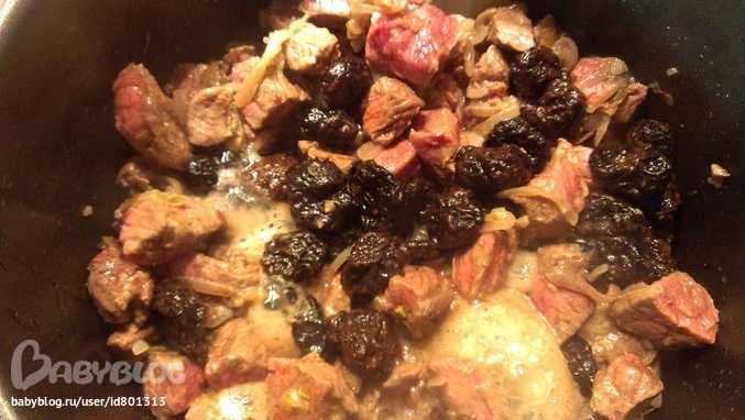 Затем добавляем чернослив, солим-перчим. У меня было концентрированное молоко, которое нужно было куда-нибудь деть, вот я его смешала с ложкой аджики, развела слегка водой и добавила в мясо.
