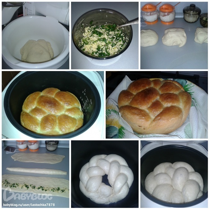 Замесить тесто, разделить его на 3 равных части, раскатать полоски (можно смазать стол растительным маслом), выложить начинку, как на картинке, сформировать 3 колбаски. Далее из них сплести косичку и соединить в круг. Выложить в чашу мультиварки, включить режим "мультиповар" 40 градусов на 1 час для расстойки теста. Далее режим выпечка 45-50 минут, по окончании режима, перевернуть наш хлеб на другую сторону и выпекать еще 15 минут. (Маленький секрет-чтоб верх был красивый и румяный, можно смазать хлеб взбитым яйцом и отправить в духовку на 10-15 минут)