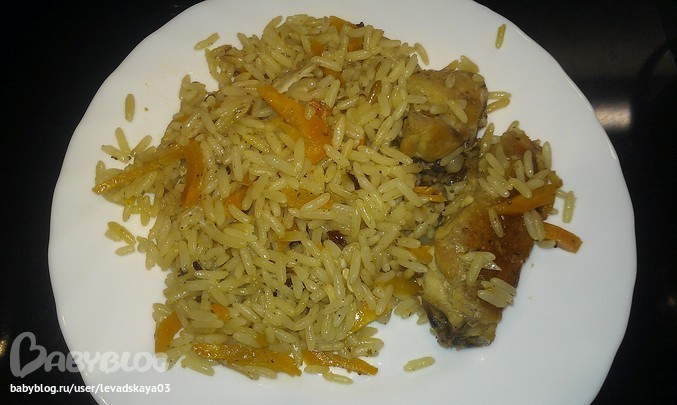 Курицу обжарила на режиме жарка минут 15 до корочки, положила лук, морковь соломкой, сверху рис, посолила, поперчила, приправа к плову еще была и залила водой (в соотношении 1 к 2). Включила режим РИС и через 45 минут ВУА ЛЯ!!!!!!!!!!!!!! Рисинка к рисинке!!!!!!!!