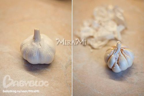 Открыть крышку, достать и выкинуть чеснок (ну или отдать на съедение любителю такого). Тщательно, но аккуратно перемешать.