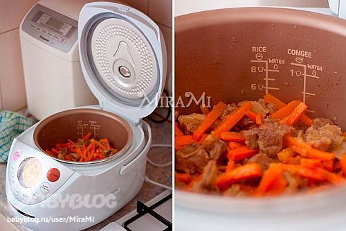 Ждем 2 минуты, чтобы масло тщательно прогрелось, забрасываем мясо. Жарим мясо, периодически помешивая до испарения жидкости (для ориентировки – у мужа это заняло 25 минут – т.е. когда жидкость испарилась, на дисплее мультиварки показывало, что до окончания осталось 35 минут).
