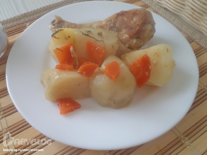 600 г куриных голеней обмазать смесью из соли, оливкового масла, чёрного молотого перца, мелко нарубленного чеснока и зелени укропа. Выложить голени в кастрюлю мултиварки, режим "выпечка". Почистить сырой картофель, морковь, нарезать произвольно, выложить овощи в мультиварку поверх куриных голеней, посолить. Оставить на "выпечке" до окончания (по умолчанию 40 минут). После окончания программы на 10 минут оставить в режиме "подогрева". Ничего не переворачивала и не перемешивала, жикости не добавляла.