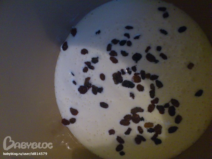 и в смазанную маслом чашу мультиварки. забыла про изюм, поэтому сверху его покидала, думала "утонет", но нет, так сверху и остался))))