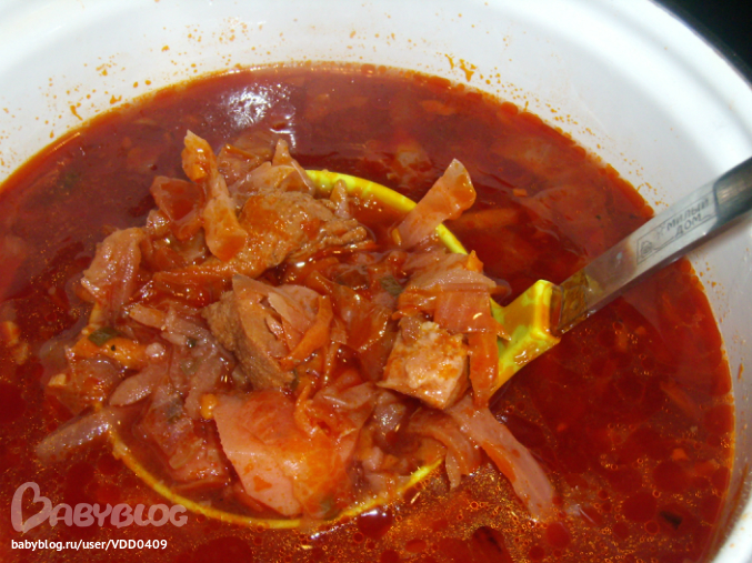 Выглядит аппетитно! Я тоже на днях варила. Правда, я не сразу все клала, сначала с открытой крышкой потушила овощи: морковку, лук, свеклу, томаты, перчик, а потом уже добавила остальное и варила. Ням-ням!