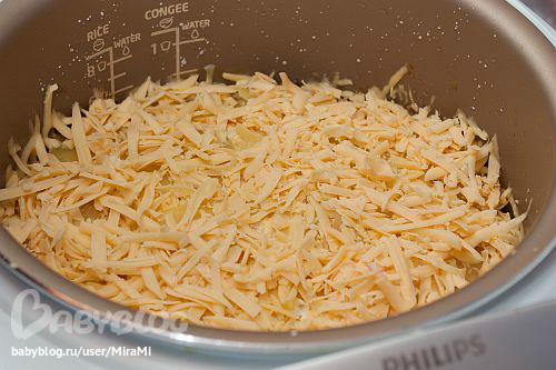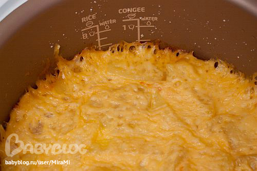 Когда 45 минут истекут (мультиварка Вам об этом пропикает), открываем крышку и равномерно засыпаем все сыром.