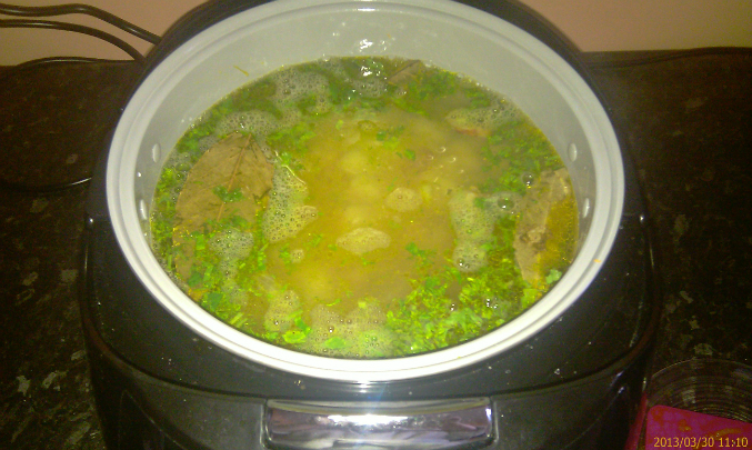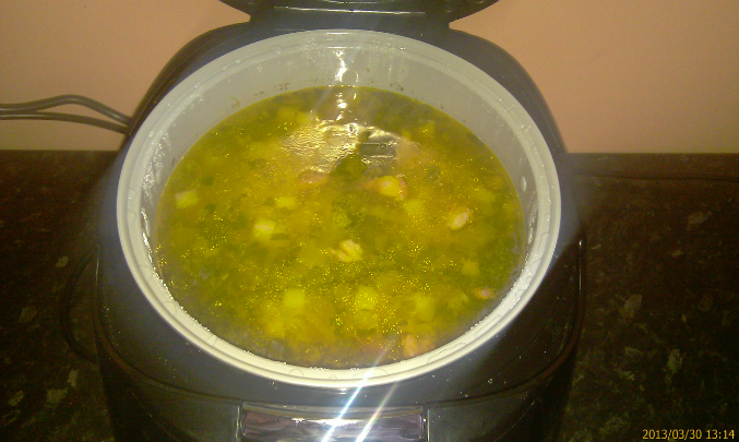 на будущее - горох буду брать целый и не буду замачивать (я люблю когда горошинки очущаются в супе)