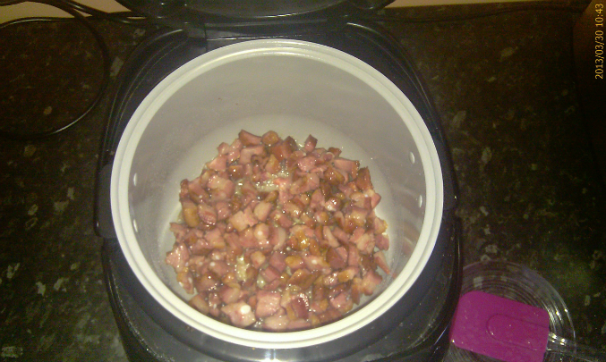 мясо порезала на кусочки и обжарила в мульте на режиме "Жарка". масло не добавляла