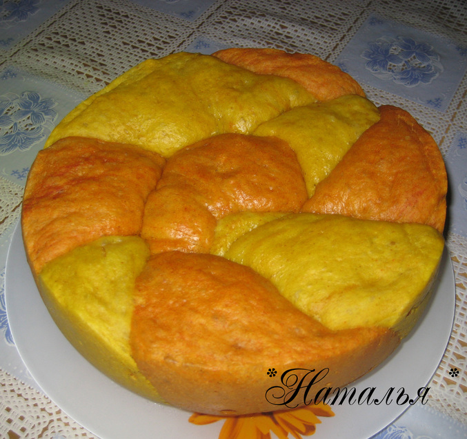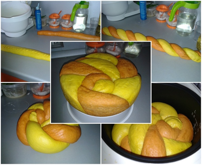 Замесить тесто, разделить его на 2 равных части, в одну добавить куркуму, а в другую сладкую паприку и до красивого насыщенного цвета вымесить. Раскатать полоски (можно смазать стол растительным маслом), выложить начинку, сформировать 2 колбаски. Перекрутить их между собой и соединить в круг. Выложить в чашу мультиварки, включить режим "мультиповар" 40 градусов на 1 час для расстойки теста. Далее режим выпечка 45-50 минут. (Я не переворачивала, верх итак был готов и был мягкий). Накрыть полотенцем и дать остыть. Аромат не передоваемый