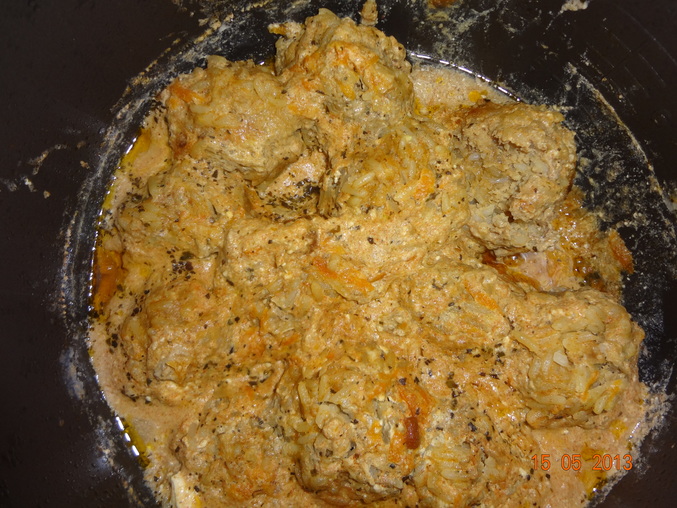 Выложила на дно мульти готовые овощи, сверху сформированные ежики, залила смесью магги (на 500 мл молока 1 пакетик) и добавила сметаны. Если не любите приправы, можно все так же, а вместо магги, добавить муки.