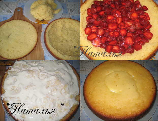 После того как кекс остынет, острым ножом по всему периметру сделать надрез и осторожно срезать верх пирога не толще 2-3 мм и отложить. Середину пирога аккуратно вырезать (хорошо снимается ложкой), оставив дно 1 см, и раскрошить в тарелку. В сметану добавить сахар, перемешать ,выложить разрезанную на 2-4 части клубнику, на клубнику выложить крошку, и сверху равномерно вылить сметану. Накрыть срезанным верхом, чуть-чуть придавить и поставить в холодильник на 1 час. Но если пирог постоит в холодильнике несколько часов, он пропитается лучше и будет еще вкуснее.