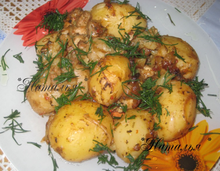 В пакет (рукав) закладываем молодой картофель, лук измельченный , специи, соль, мясо (сало) . Завязываем пакет, сверху делаем несколько отверстий. Укладываем в чашу ( можно на дно положить силиконовый коврик), уст. прог. Выпечка на 1 час.