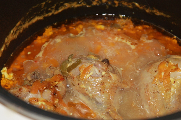 Блюда из птицыполучилось у меня сегодня приготовить ужин, а главное,почти без моего участия,люблю свою помощницу.А готовила я молодую картошечку на пару и тушила курочку. В кастрюлю положила куриную голень,посыпала сверху тертой морковкой, добавила болгарский перец. Лука в доме не оказалось,но ,думаю, с ним было бы еще лучше. Все посолила,добавила приправу для курицы, потом налила чуть-чуть воды и добавила немного майонеза. сверху водрузила картоху,чтобы варилась на пару, закрыла и отправилась гулять с ребенком. Пришли с ним, открываем,а там такая красота! Я сомневалась насчет майонеза, так как считаю, что детям вообще противопоказан, но здесь согрешила, получилось совсем не жирно,нежно, сын покушал с аппетитом. Такой вот экспресс-рецепт. Завтра еще и папку накормим.
