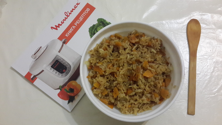 я 10 мин жарила морковь с луком на режиме Жарка, потом закинула отмоченный рис (длинно-зернистый) и поставила на Плов 20 мин, все. Но у меня скороварка, может потому что под прессом готовит, получилось....