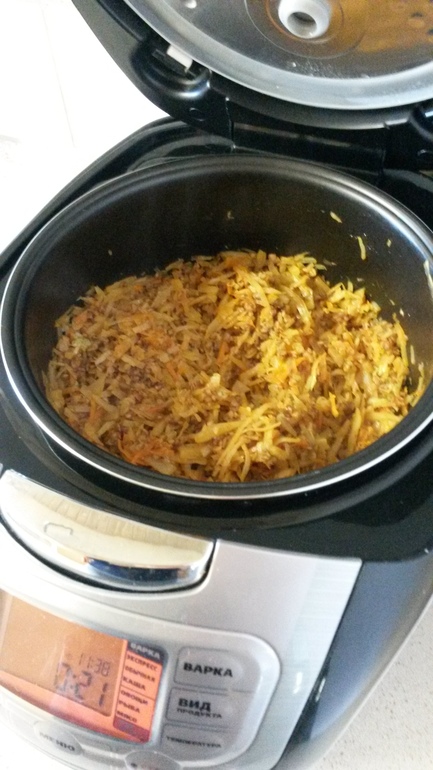 После сигнала оставила на режиме поддержания тепла еще на 30 минут (гречка была не полностью готова, но за 30 мин. тепла она 'дошла'), еще добавила тертых пару зубчиков чеснока.