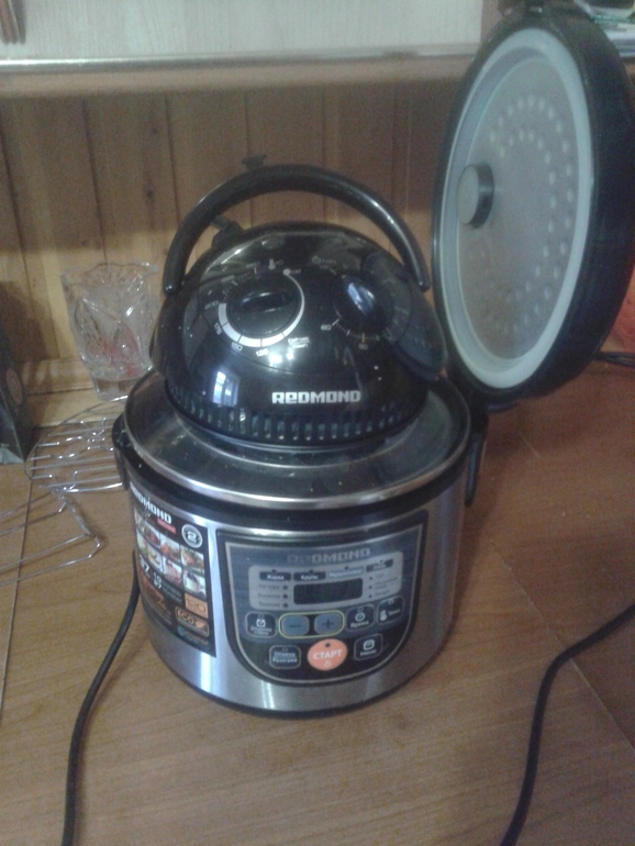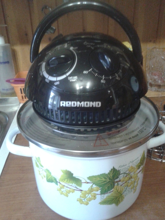 Разное околомультиварочное :-)) Мое новое приобретение , аэрогриль Редмонд , давно уже на него заглядываюсь , да все сомневалась брать просто крышку или купить полноценный гриль с чашей . Решилась на крышку , так как с чашей просто уже не знала куда ставить. Вчера вечером испытали приготовили бутеры с сыром и ветчиной ( кетчуп , майнез) сфоткать не успела , но получилось вкусно , хлеб слегка хрустящий , не пересушенный , готовились 5 минут. Сегодня у нас была курица , обмазала ее горчицей и майонезом , добавила соль , специи и поставила на низкую решетку. Курица всеже большая , решила готовить ее в обычной кастрюле , готовилась долго 1 час и 40 минут , перевернула курицу 1 раз. Получилось очееь вкусно а главное никакого брызгающего жира и копоти , кастрюльку вымыла легко , крышку тоже. Если торопиться не куда , то вариант хороший. Пробовала размораживать мясо , чуть дольше чем в инструкции , но размораживает. А главное , для меня , она много места не занимает. Фото прилагаю.