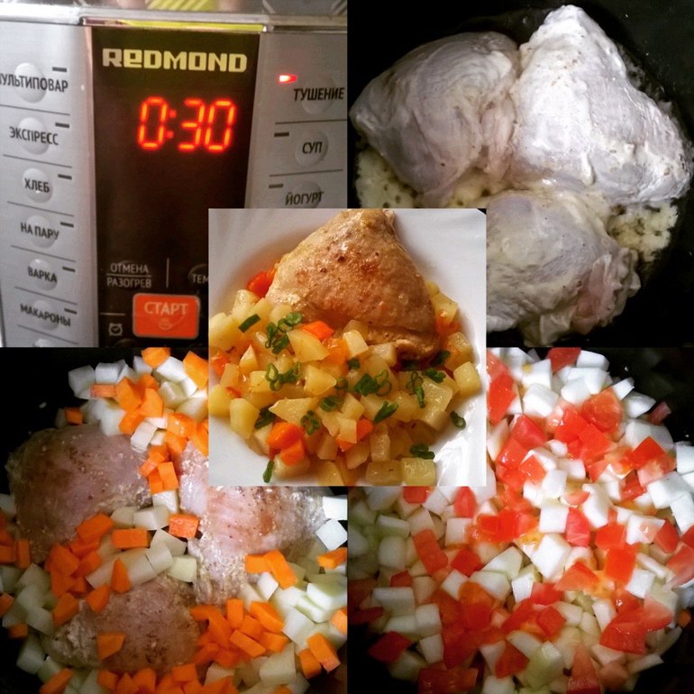 Блюда из птицыБедрышки с овощами с мультиварке Редмонд 26 (можно адаптировать под любую мультиварку) Бедрышки замариновала в сметанке с приправами. На программе "Жарка" обжарить до корочки буквально по несколько минут с каждой стороны. Переключить на "Тушение" и добавить нарезанные кубиками овощи, любые любимые - кабачок, картофель, морковь, помидорку. Программу мультиповаром задаю на 30 минут. После звукового сигнала можно подавать к столу, присыпав свежей, нашинкованной зеленью.