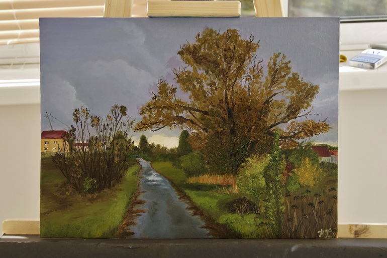 Натали, передний план слишком резок и контрастен, я бы сделала растушевку сухой кистью (каждый раз после проведения кистью вытирать кисть тряпкой) со стороны дороги -серый цвет- накладывать на коричневый "покрывая" его сверху. таким образом он начнет смазываться и станет более прозрачным, снимется контрастность. Лужи и рельеф асфальта на дороге сделан очень реалистично. Само дерево очень хорошо прорисовано, а зонтики на переднем плане просто отлично! Ярковаты домики, но художник в оттенках имеет право на свое чувство цвета, так что только плюс, благодаря домикам нет пастельности всей картины!!! На дальнем плане там где солнце, можно добавить белил, для яркости лучей уже невидимого нам солнца. Собачка не всегда нужна, это я поняла, когда прочитала диалог профессиональных художников о дополнительных реальных элементах и героях в картинах (силуэт девушки, птицы, парусники, животные) - они могут стать главными героями картины и отвлечь на себя внимание зрителя. Для того, что бы добавлять животное в картину, нужно уметь его прорисовать, а это не всегда удается, картина может быть испорчена не профессионализмом художника. Так, что я за то, что бы собаки на картине не было. Казалось бы, банальная фотография, а на картине это место близкое и милое сердцу нашему художнику - Натали, стало красивым пейзажем! Прекрасный пейзаж в стиле реализма!+++