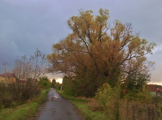 Теперь на ваш суд. Это вид дороги к родительскому дому, а дерево - ветла - на ней мы в детстве построили шалаш, в ветвях, а потом три поколения детей его достраивали и играли там в соловья-разбойника.