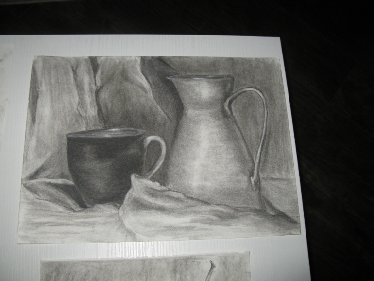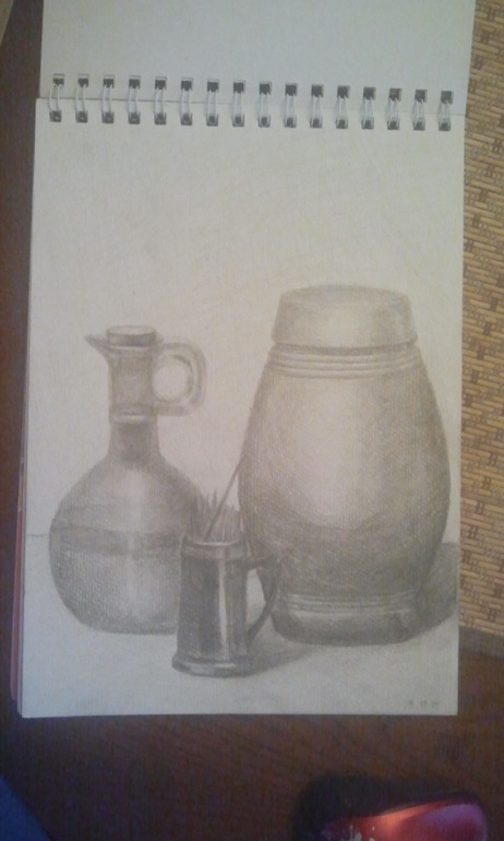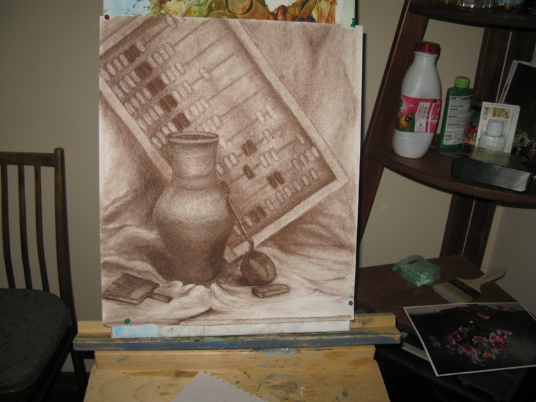 В этих работах углем тоже полно косяков, но осознание этих косяков мне очень помогает не допускать их в след. работах. На занятии я начала сложный натюрморт из 7 предметов, рисую теперь сепией, тоже интересный материал))))