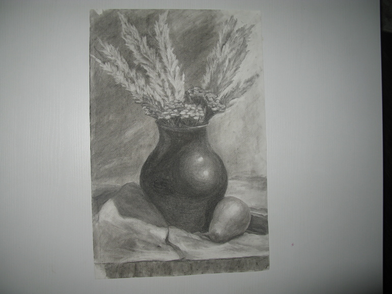 На следующем занятии я познакомилась с углем и была от него в восторге! родился этот натюрморт, кувшин я привезла из Суздаля, он абсолютно черный и блестящий, таким его сделал обжиг в березовых углях. Колосики тоже сама летом собирала, и пижму тоже))))